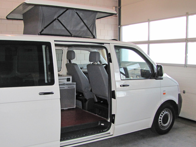 Nu kan er begonnen worden met het opbouwen van de camper. Het plafond wordt verwijderd evenals de bestaande verlichting. De elektriciteit wordt omgelegd. Dit alles als voorbereiding op de montage van het hefdak. Hiervoor wordt een gat in het dak gezaagd, het verstevigingframe gemonteerd. Hierna het dak en de tentbalg aan de carrosserie.